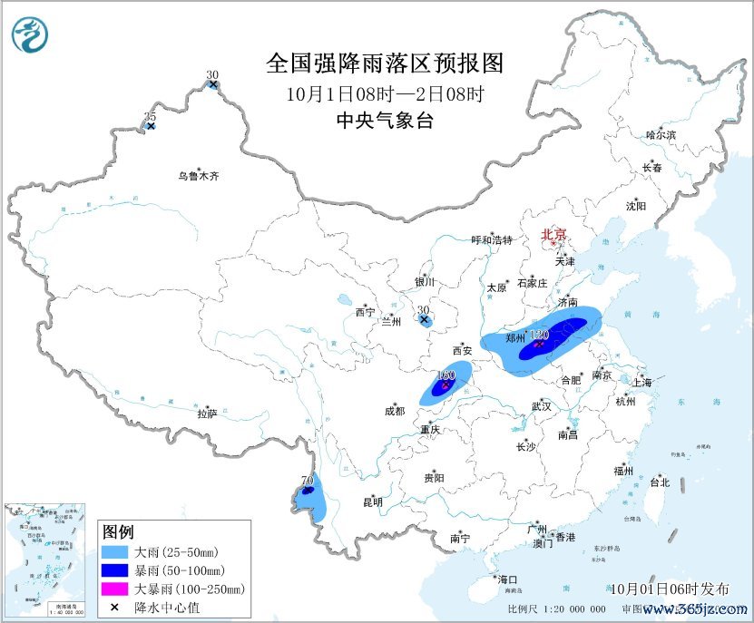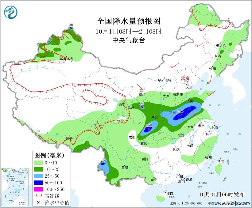 10月1日08时至2日08时,新疆北部、西藏东南部、甘肃东部、宁夏南部、陕西中南部、山西南部、河南大部、山东中南部、苏皖北部、湖北北部、四川东北部、重庆北部、云南西部等地部分地区有中到大雨,其中,山东南部、河南中东部、安徽北部、江苏北部、四川盆地东北部、云南西部等地部分地区有暴雨,局地大暴雨(100~160毫米)。新疆北部、内蒙古中东部、辽东半岛、山东半岛、安徽北部等地部分地区有4~6级风。