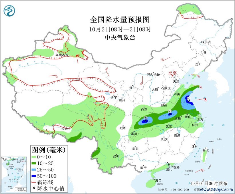 10月2日08时至3日08时,山东中南部、江苏大部、安徽中北部、河南南部、湖北中北部、重庆中北部、四川东北部等地部分地区有中到大雨,其中,山东南部、江苏北部、河南南部、重庆北部等地部分地区有暴雨(50~70毫米)。内蒙古中西部、辽东半岛、山东半岛等地部分地区有4~6级风;黄海中南部海域将有6~8级、阵风9级的大风。
