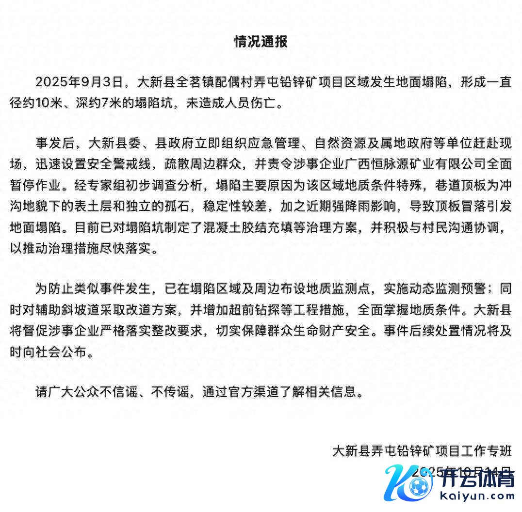 据“本日大新”微信公众号10月15日音书,广西崇左市大新县弄屯铅锌矿方法责任专班14日发布“情况通报”称,该县一铅锌矿发生塌陷云开体育,涉事企业被全面暂停功课。以下为细则——